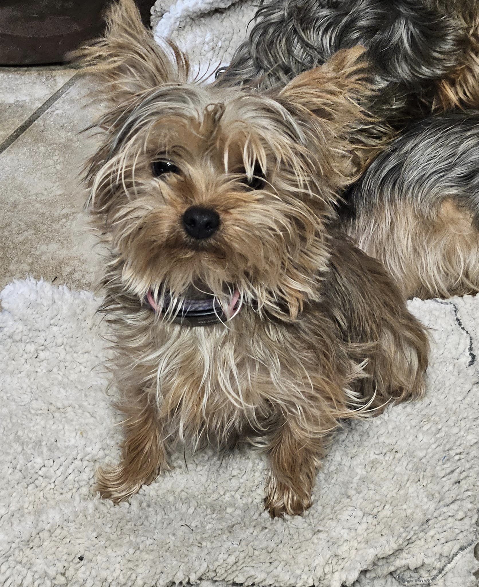 Iris is a chocolate Yorkie. She's still a purebred Yorkie, but her coat is all brown. Daisy and JJ are traditional Yorkies, meaning they were black and brown at birth. Iris is a bit of a scaredy cat, but she's very sweet and loving.