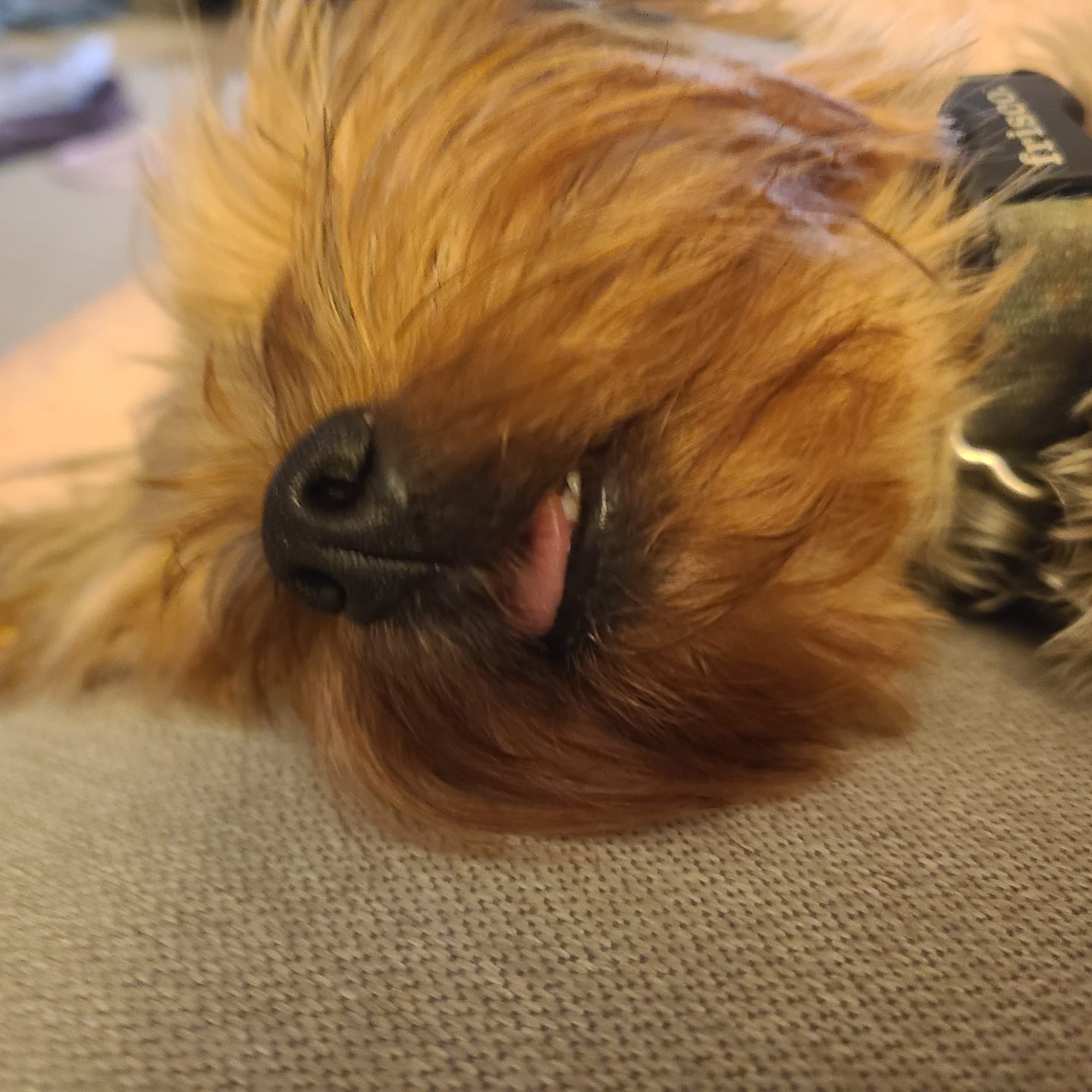 Daisy is by far my calmest and snuggliest dog. My elderly Aunt wanted to hold one of my dogs, and I told her Daisy was definitely the one for her to hold. lol! Daisy likes to lay between the back of my neck and the chair I'm in, and rests her head on my left shoulder. Always the left. lol! When she's sleeping elsewhere, she lays all crazy, and usually with her tongue out: